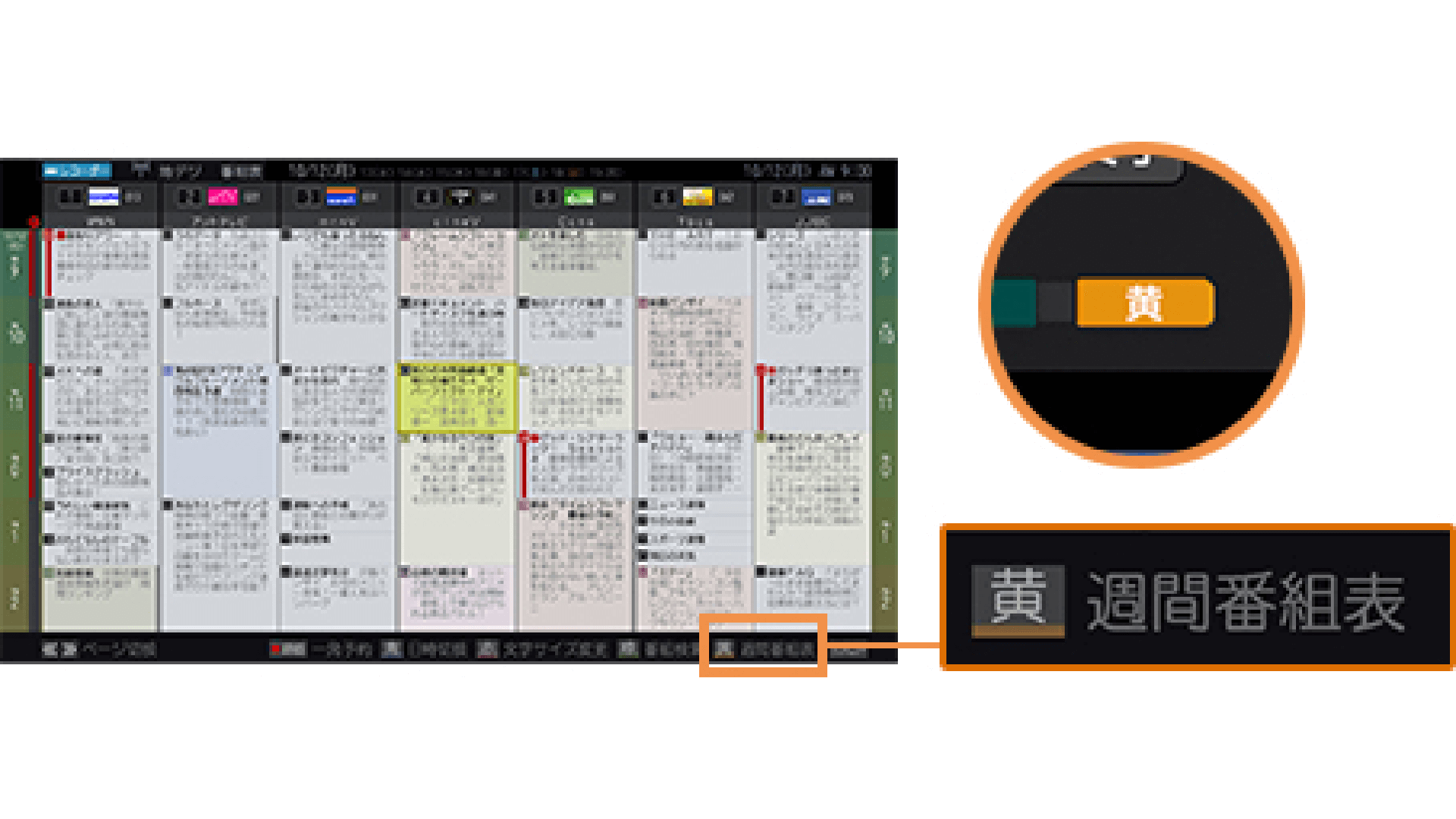 ジャンルの色分け表示や、番組名の強調、土日の色表示など、見やすく使いやすい高精細の番組表を搭載。また、番組表で表示するチャンネル数や時間帯の種類を増やし、日付時間帯の選択をさらにわかりやすくするなど使い勝手を良くしました。
