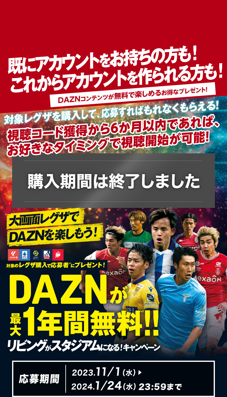 • DAZN無料視聴クーポン(ギフトコード)は配信⽇から6か⽉以内のご登録が必要です。