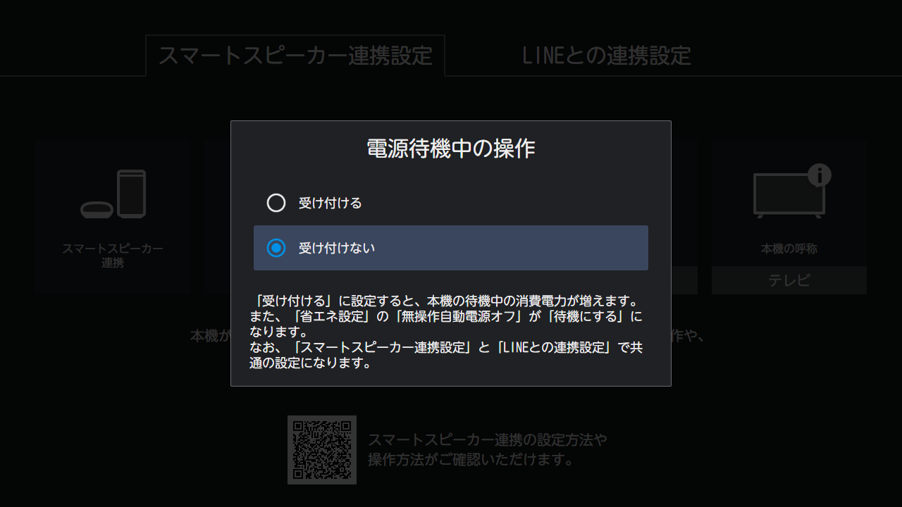 「受け付ける」を選択すると、本機が電源待機状態(リモコンで電源オフした状態)でもスマートスピーカーから操作できるようになります (本機の待機中の消費電力が増えます。「省エネ設定」の「無操作自動電源オフ」が「待機する」になります)。