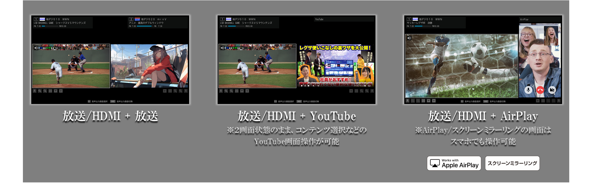 右画面:放送(地上デジタル/ BS / 110度CS)、YouTube、AirPlay、スクリーンミラーリング