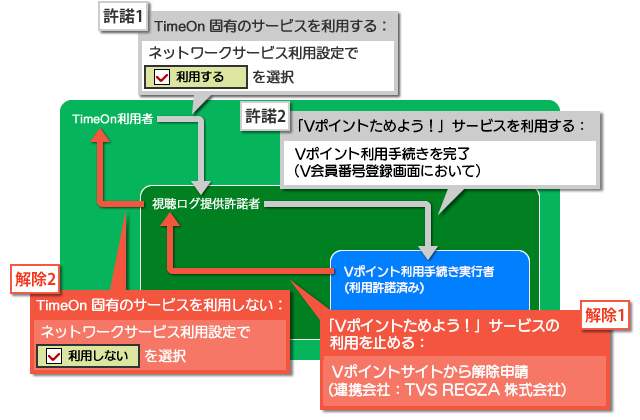 「Vポイントためよう!」サービスを利用していると、利用履歴に基づいてVポイントが付与されるキャンペーンに応募できる一方で、お客様と Vポイントマーケティング株式会社 (以下、VPMK) の間の許諾条件に従い、視聴履歴に基づく情報が VPMK に提供されることがあります。